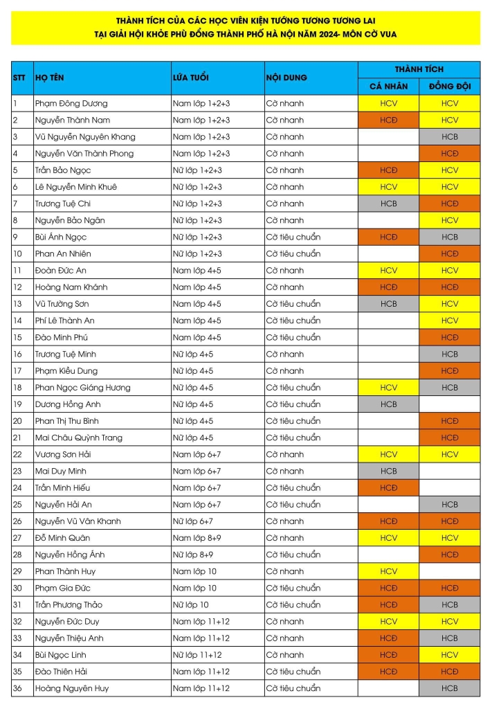 Chúc mừng 36 học viên của Kiện Tướng Tương Lai đạt huy chương tại giải Hội khỏe Phù Đổng Thành Phố Hà Nội năm 2024 – Môn cờ vua. Điều đặc biệt là các học viên đã đạt huy chương cá nhân hoặc đồng đội tại tất cả các bảng đấu trong tổng số 12 bảng đấu của giải.