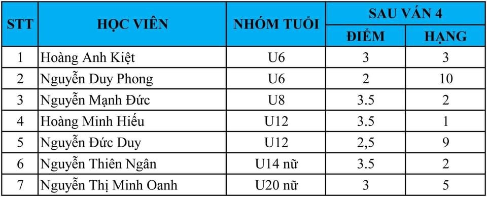 Câu lạc bộ Kiện Tướng Tương Lai có 7 học viên tham gia giải đấu này. Tính tới thời điểm hiện tại, các kỳ thủ đang thi đấu ván 5 ở nội dung cờ tiêu chuẩn.