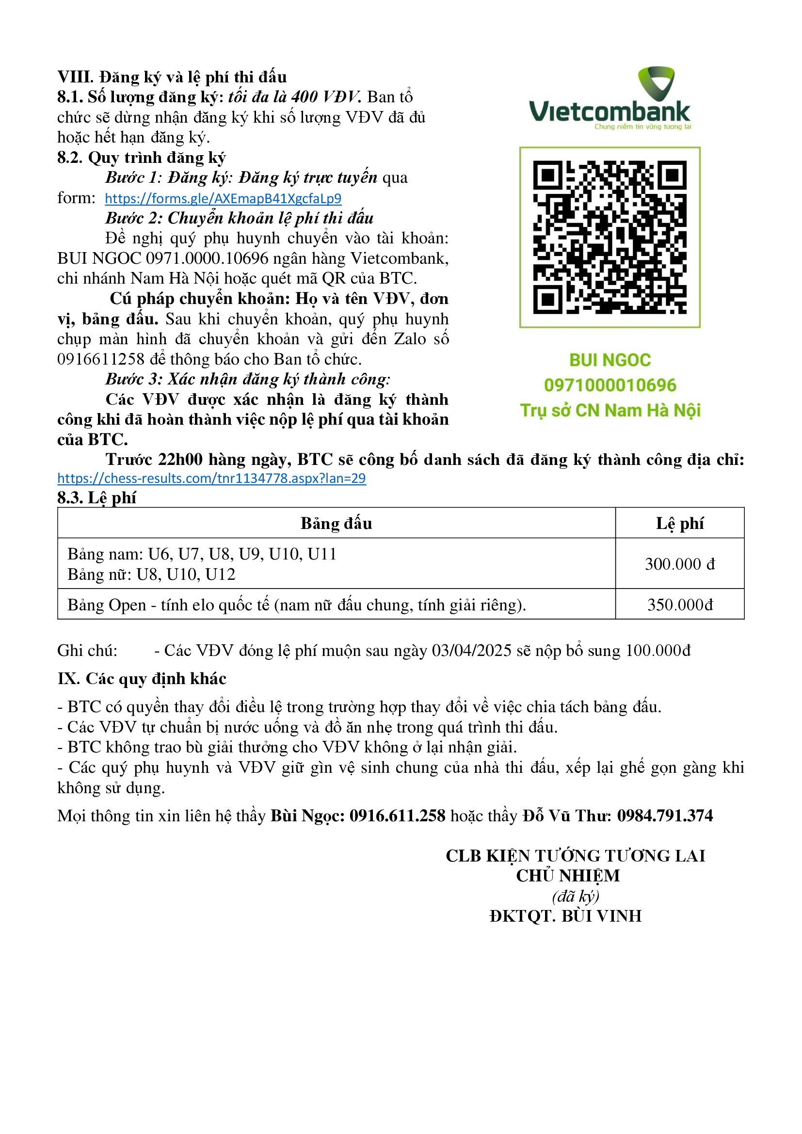 Đề nghị quý phụ huynh chuyển vào tài khoản: BUI NGOC 0971.0000.10696 ngân hàng Vietcombank, chi nhánh Nam Hà Nội hoặc quét mã QR của BTC.