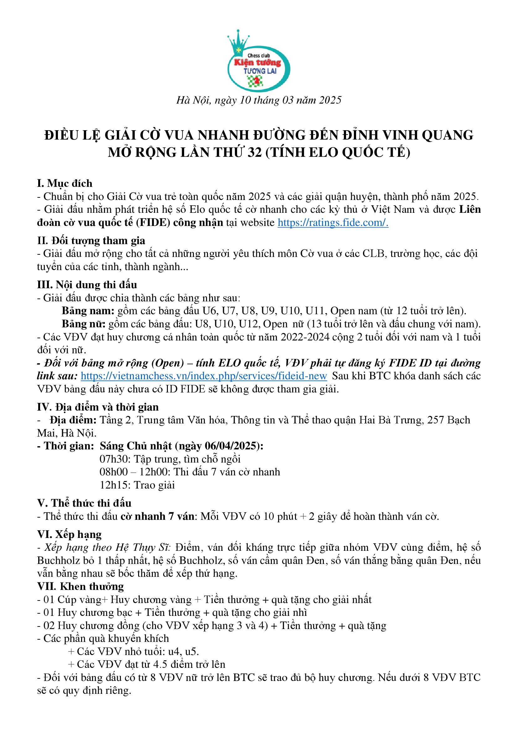 ĐIỀU LỆ GIẢI CỜ VUA NHANH ĐƯỜNG ĐẾN ĐỈNH VINH QUANG MỞ RỘNG LẦN THỨ 32 (TÍNH ELO QUỐC TẾ)