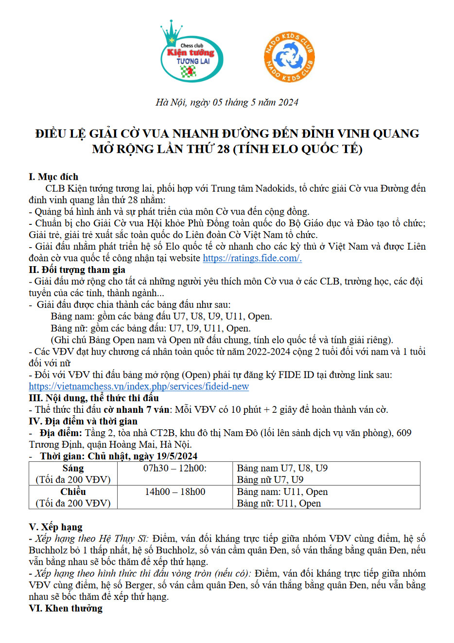 GIẢI CỜ VUA ĐƯỜNG ĐẾN ĐỈNH VINH QUANG LẦN THỨ 28 (TÍNH HỆ SỐ ELO QUỐC TẾ) hân hoan thông báo chính thức khởi tranh! Giải đấu được tổ chức bởi CLB Kiện Tướng Tương Lai và Trung tâm Nadokids, hứa hẹn mang đến những màn so tài đỉnh cao và những trải nghiệm tuyệt vời cho tất cả các kỳ thủ tham dự.