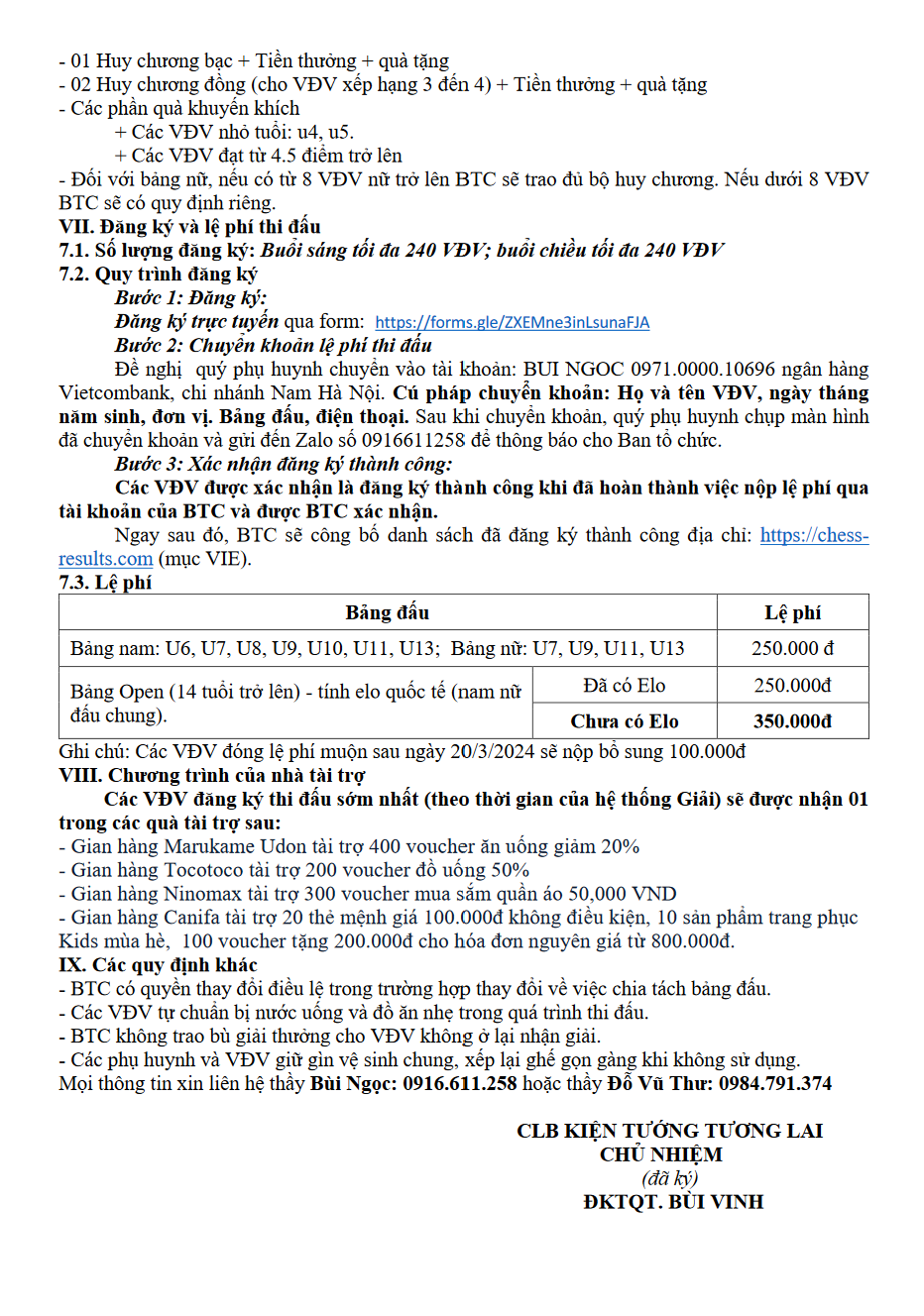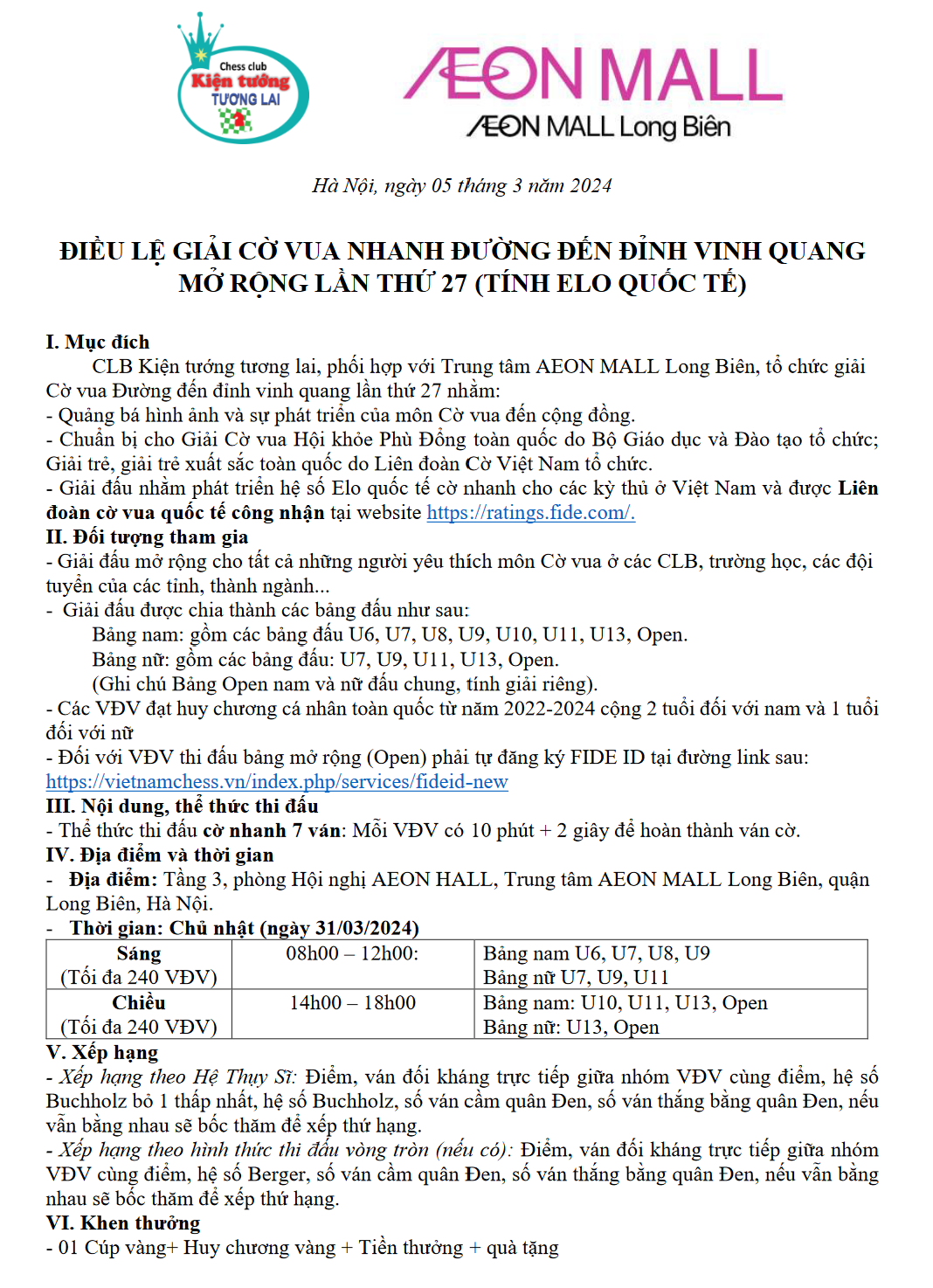 Giải đấu ĐIỀU LỆ GIẢI CỜ VUA NHANH ĐƯỜNG ĐẾN ĐỈNH VINH QUANG MỞ RỘNG LẦN THỨ 27 (TÍNH ELO QUỐC TẾ) Link đăng ký https://forms.gle/ZXEMne3inLsunaFJA