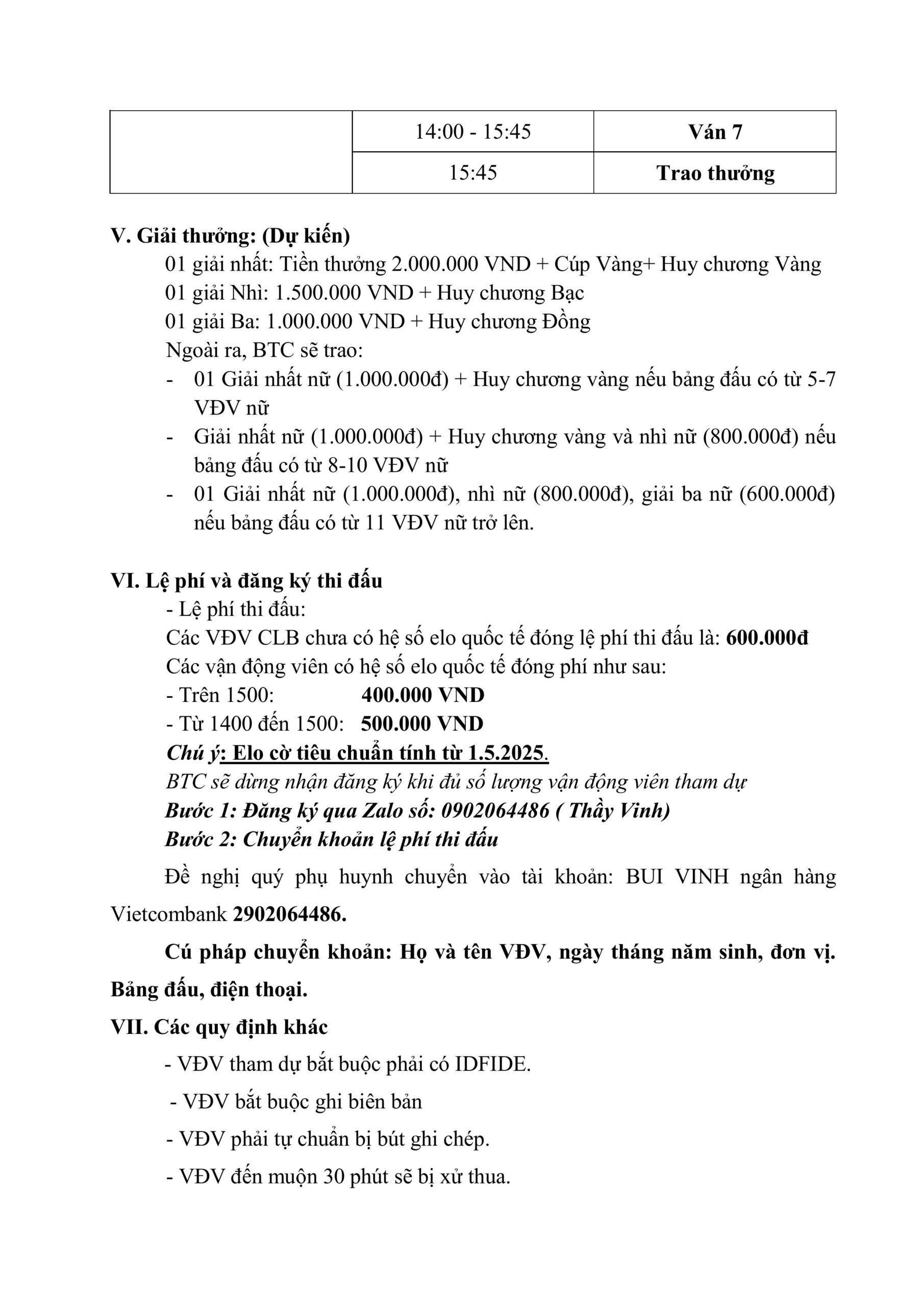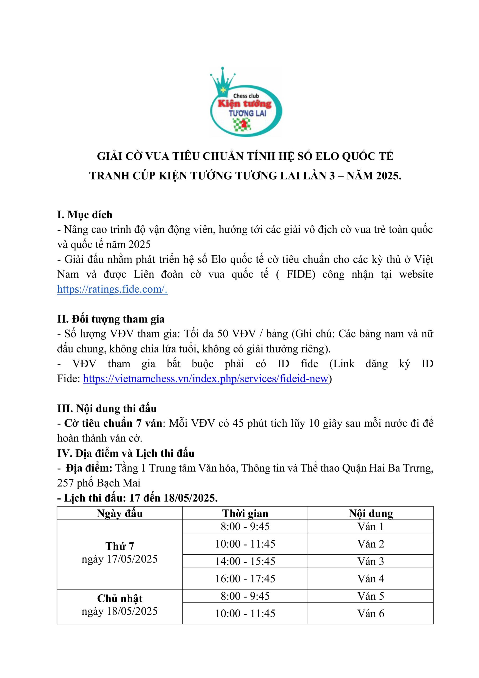 Giải Đấu, Giải đấu, Tin tức Điều Lệ Giải Cờ Vua Tính Hệ Số ELO Quốc Tế Tranh Cúp Kiện Tướng Tương Lai Lần 3 – 2025