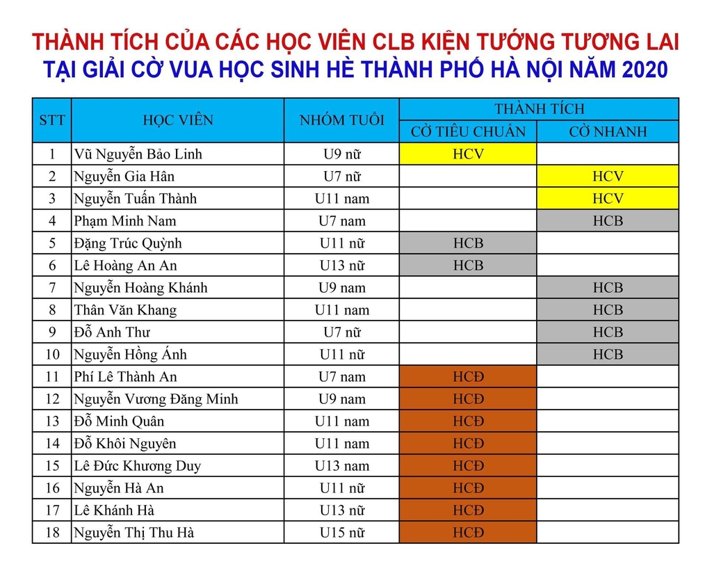 Qua 2 ngày thi đấu căng thẳng tại Nhà thi đấu Trịnh Hoài Đức với 2 nội dung cờ tiêu chuẩn và cờ nhanh, 18 học viên của câu lạc bộ Kiện Tướng Tương Lai đã đạt huy chương cá nhân giải Cờ vua học sinh hè thành phố Hà Nội năm 2020.