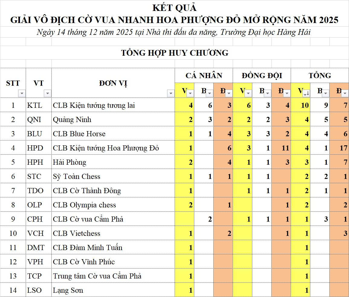 Ngày 14/12/2025 vừa qua, tại Nhà thi đấu đa năng Trường Đại học Hàng Hải (Hải Phòng), đoàn quân của CLB Kiện Tướng Tương Lai (KTTL) đã có một ngày thi đấu thăng hoa và đầy cảm xúc tại Giải Vô địch Cờ vua Nhanh Hoa Phượng Đỏ Mở rộng năm 2025.