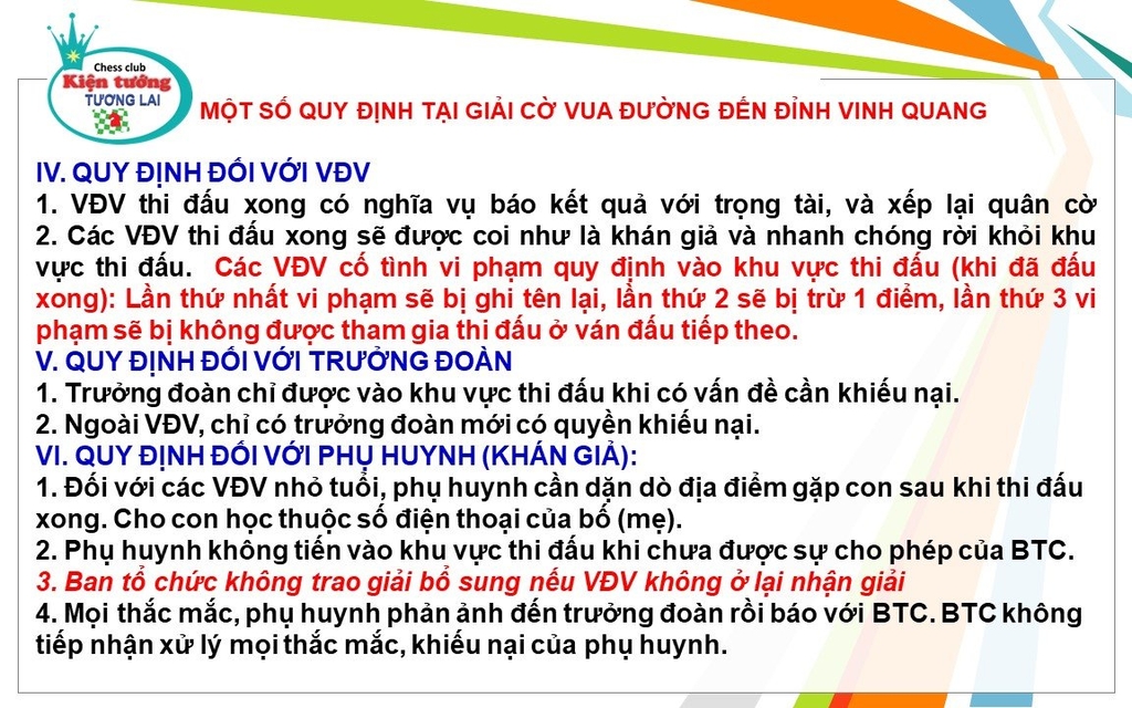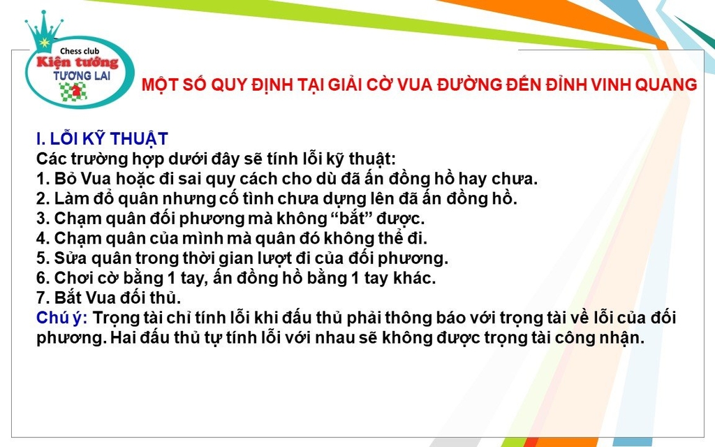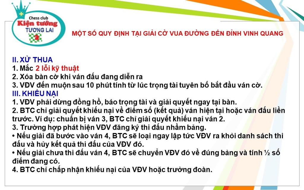 Chào mừng các bạn đến với giải cờ vua “Đường Đến Đỉnh Vinh Quang”. Để giải đấu diễn ra một cách trật tự và chuyên nghiệp, chúng tôi xin giới thiệu một số quy định quan trọng mà các bạn cần lưu ý: