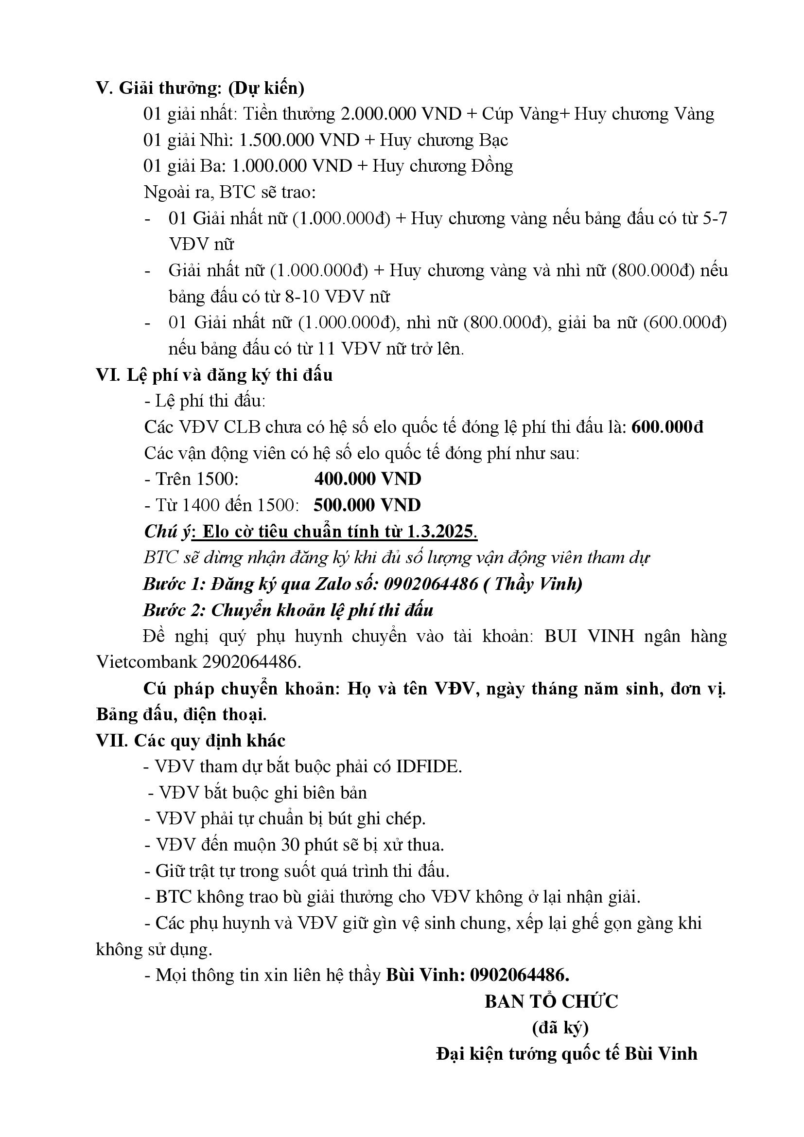 Cú pháp chuyển khoản: Họ và tên VĐV, ngày tháng năm sinh, đơn vị. Bảng đấu, điện thoại.