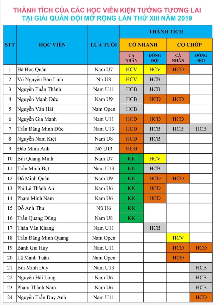 Qua hai ngày thi đấu tại TTTDTT Quân Đội với hai nội dung cờ nhanh và cờ chớp, các học viên Kiện Tướng Tương Lai đã đạt tổng cộng 3 cúp vàng, 36 huy chương và 7 giải khuyến khích.