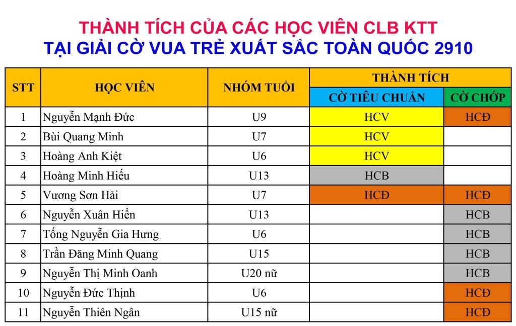 Chúc mừng các học viên của câu lạc bộ Kiện Tướng Tương Lai đạt tổng cộng 13 huy chương cá nhân (trong đó có 3 HCV, 5 HCB, 5 HCĐ) tại giải cờ vua trẻ Xuất sắc Toàn Quốc 2019.